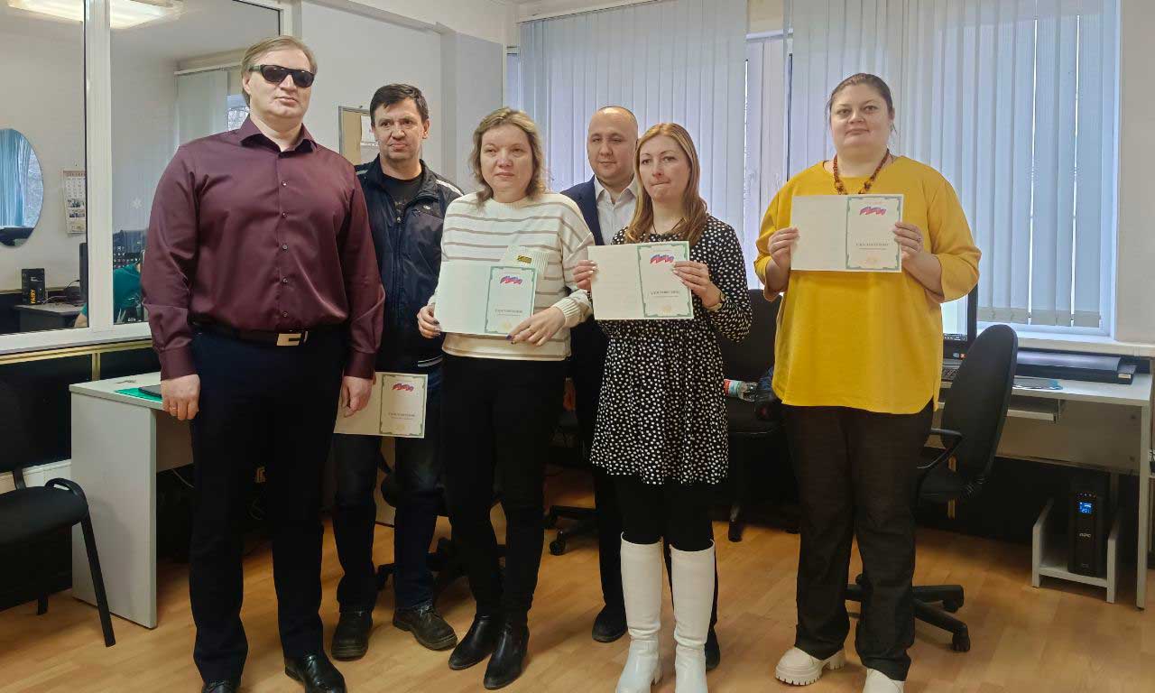 Тифлокомментарий к фотографии: Компьютерный класс Института «Реакомп». Заместитель генерального директора по информационным технологиям Е.Е. Арнапольский вместе с выпускниками программы «Информационные технологии» и преподавателем В.В. Гладышевым