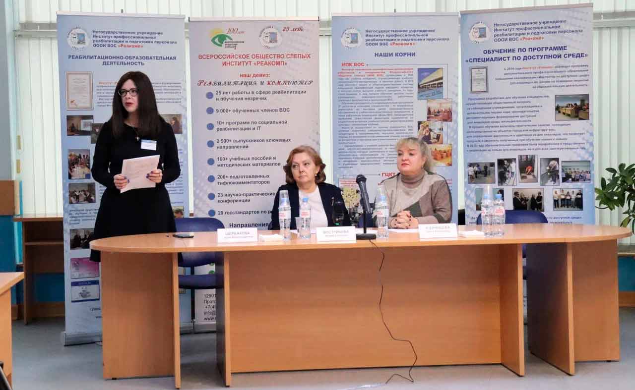 Тифлокомментарий к первой фотографии: Конференц-зал Института «Реакомп». Открытие конференции «Развитие тифлокомментирования в регионах России. Тифлокомментирование как правовая норма в обеспечении доступности информации для инвалидов по зрению». За президиумом начальник управления социального развития департамента социальной реабилитации АУ ВОС Вострикова М.Г., заместитель генерального директора по реабилитации и подготовке руководящих кадров Кудрявцева О.Е. и главный специалист по реабилитации и проектному менеджменту Щербакова М.А.