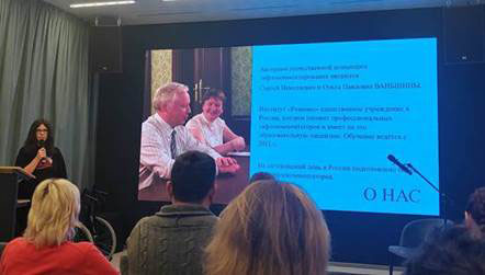 Тифлокомментарий: Лекторий. В центре, на экране, слайд презентации. На слайде фотография разработчиков отечественной концепции тифлокомментирования С.Н. и О.П. Ваньшиных и справочная информация. Слева за кафедрой М.А. Щербакова. Она говорит в микрофон. Перед ней несколько рядов слушателей.