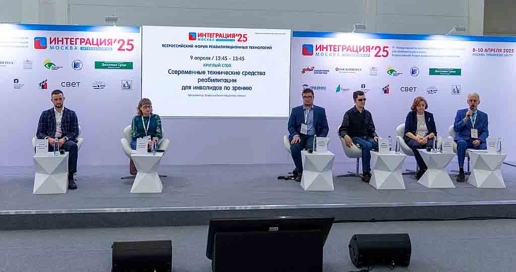 Выставка- форум «Интеграция 2025». Круглый стол «Современные технические средства реабилитации для инвалидов по зрению». Среди спикеров - сотрудник Института Туляков Е.В. Модераторы круглого стола вице-президент ВОС Коняев А.И. и начальник управления социального развития Аппарата управления ВОС Вострикова М.Г.