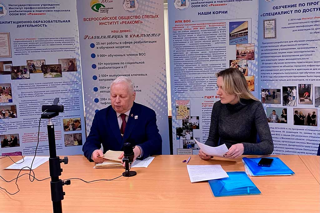 Тифлокомментарий к первому изображению. В аудитории перед камерой автор российской концепции тифлокомментирования С.Н. Ваньшин и его секретарь-референт Ю.О. Друцкая. В руках Сергея Николаевича листы бумаги с шрифтом Брайля, позади информационные стенды о деятельности Института.