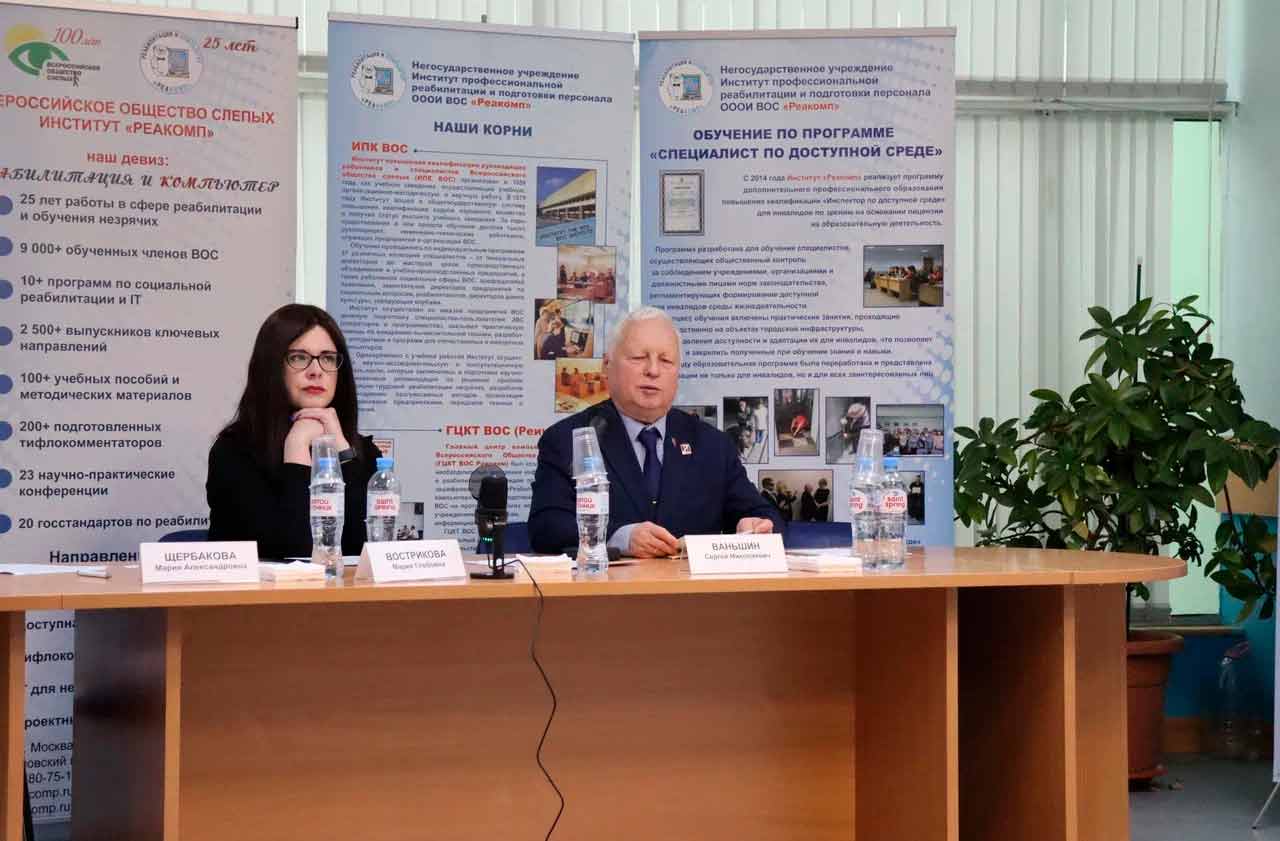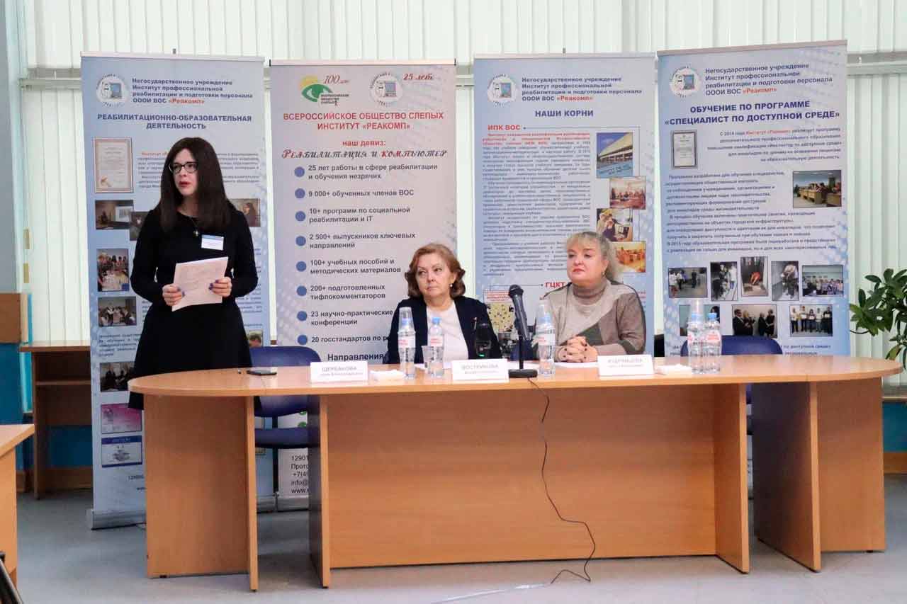 С приветственным словом на торжественном открытии научно-практической конференции к участникам обратились начальник Управления социального развития департамента социальной реабилитации Аппарата управления ВОС Мария Глебовна Вострикова, заместитель генерального директора Института «Реакомп» по реабилитации и подготовке руководящих кадров Ольга Евгеньевна Кудрявцева, главный специалист по реабилитации и проектному менеджменту, тифлокомментатор высшей категории Мария Александровна Щербакова.